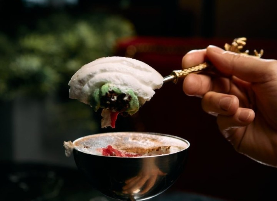 Фисташковый мусс на шоколадной крошке с щербетом из малины с клоповки и подпечённой меренгой
