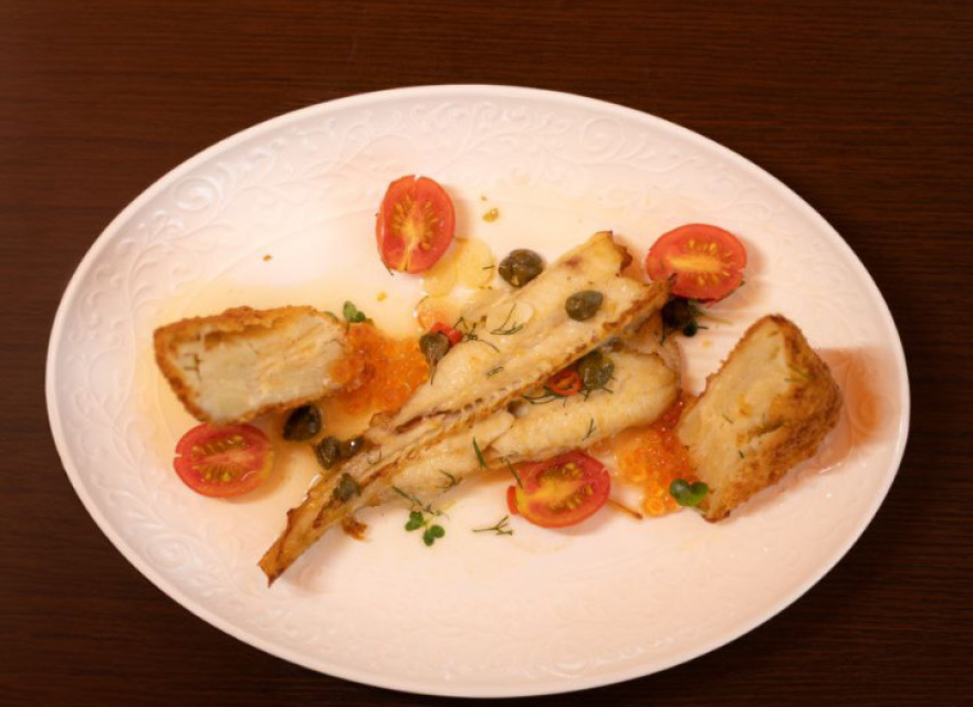Язык говяжий в глазури из аджики, с картофельным пюре с соусом хрен