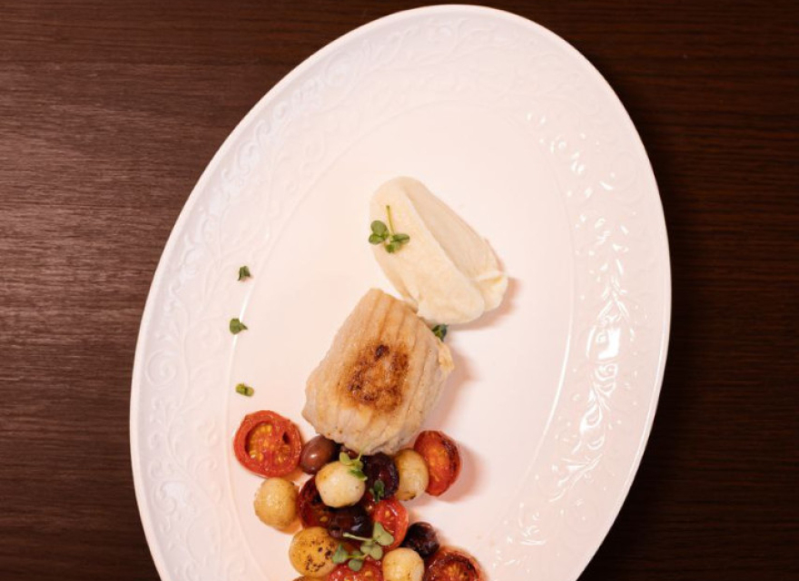 Филе крыла ската с муссом из гребешка, пюре сельдерея, картофелем, черри и маслинами