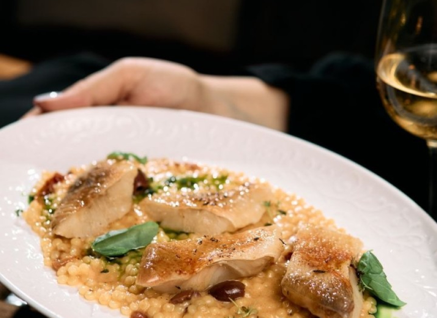 Утиная ножка конфи с кашей из кедрового ореха и соусом из жимолости
