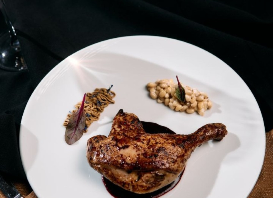 Утиная ножка конфи с кашей из кедрового ореха и соусом из жимолости